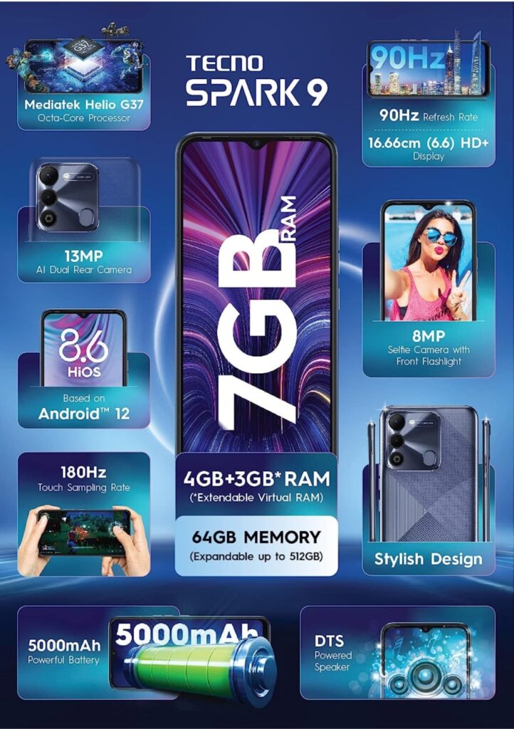 The 6.6-inch screen of the Tecno Spark 9 features an HD+ resolution. The display sports a 90Hz refresh rate and a waterdrop-shaped notch. Software-wise, this entry-level smartphone from Tecno comes pre-installed with Android 12 and HiOS UI. An octa-core Helio G37 CPU, 6GB of RAM, and 128GB of internal storage are included in the package. Additionally, the phone supports 5GB of virtual RAM and includes a microSD card slot for additional storage.